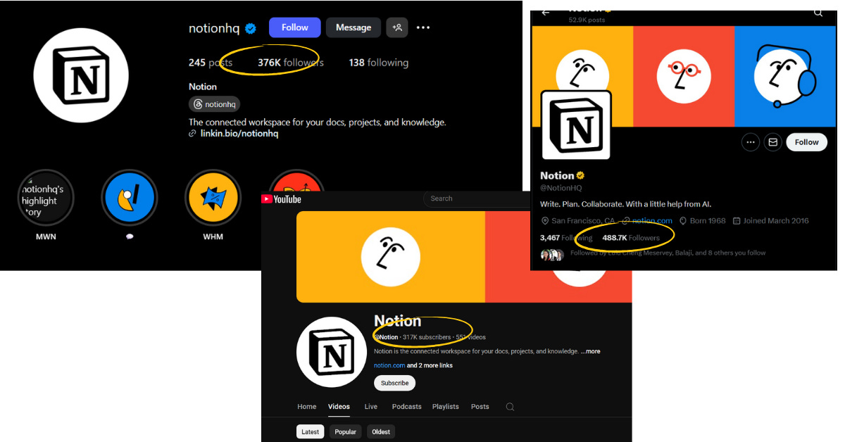 Notion’s growth was unimaginable without its social media presence. Notion has a strong social media presence (they also run ads). For example on Twitter, Notion has over 400k followers, on YouTube over 300k subscribers, and on Instagram over 300k followers.