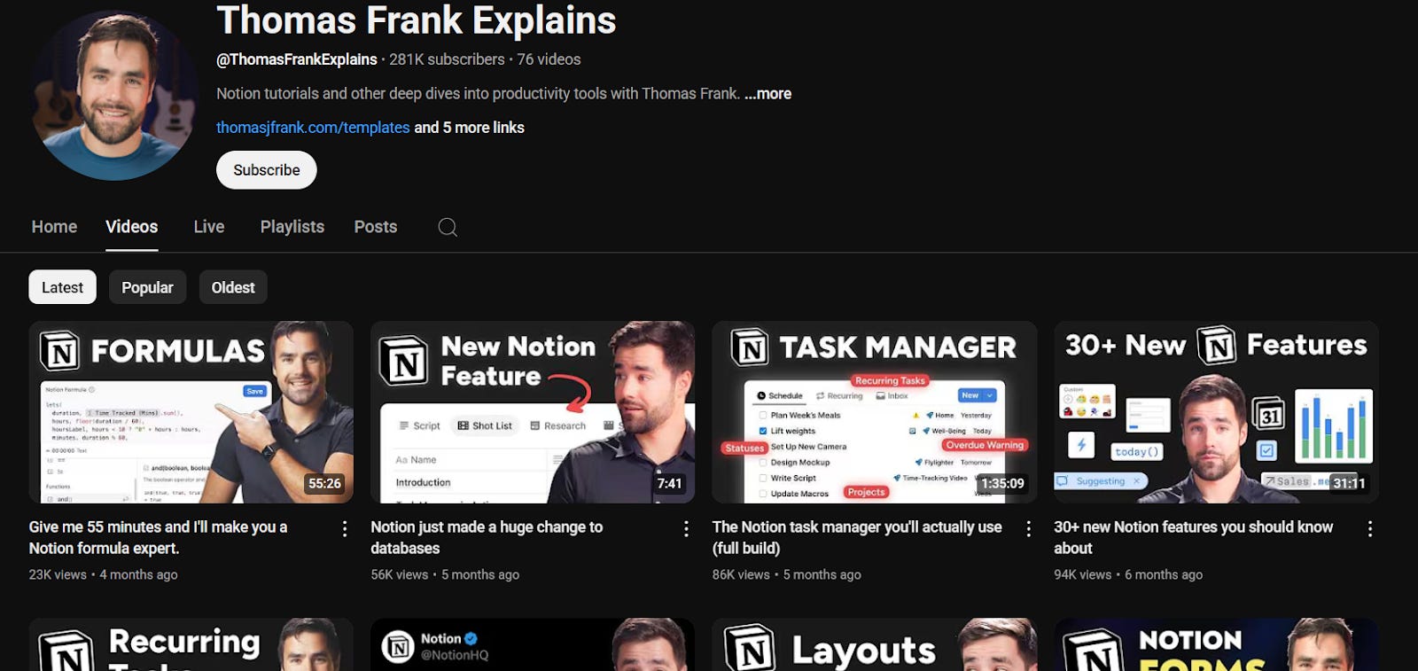 You’d be surprised to know the number of creators who “Solely” talk about Notion all day long. For example, a YouTuber like Thomas Frank, who only talks about Notion on his YouTube channel, which has 281k subscribers.