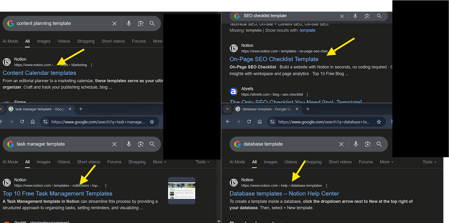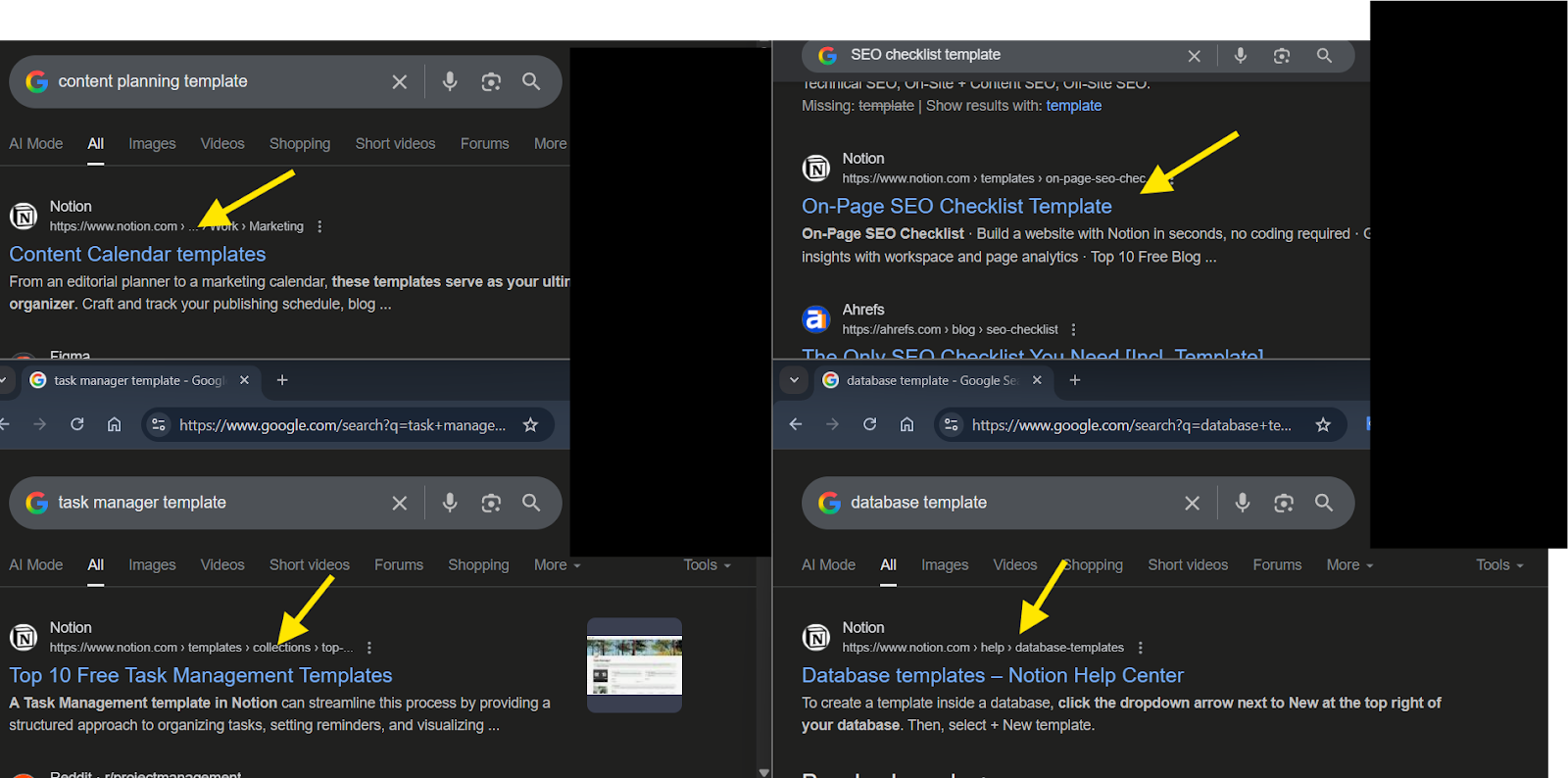 For example, if you search on Google “Notion template” or say anything including the keyword “Templates,” You’ll find Notion blogs or templates on the first page of Google.
