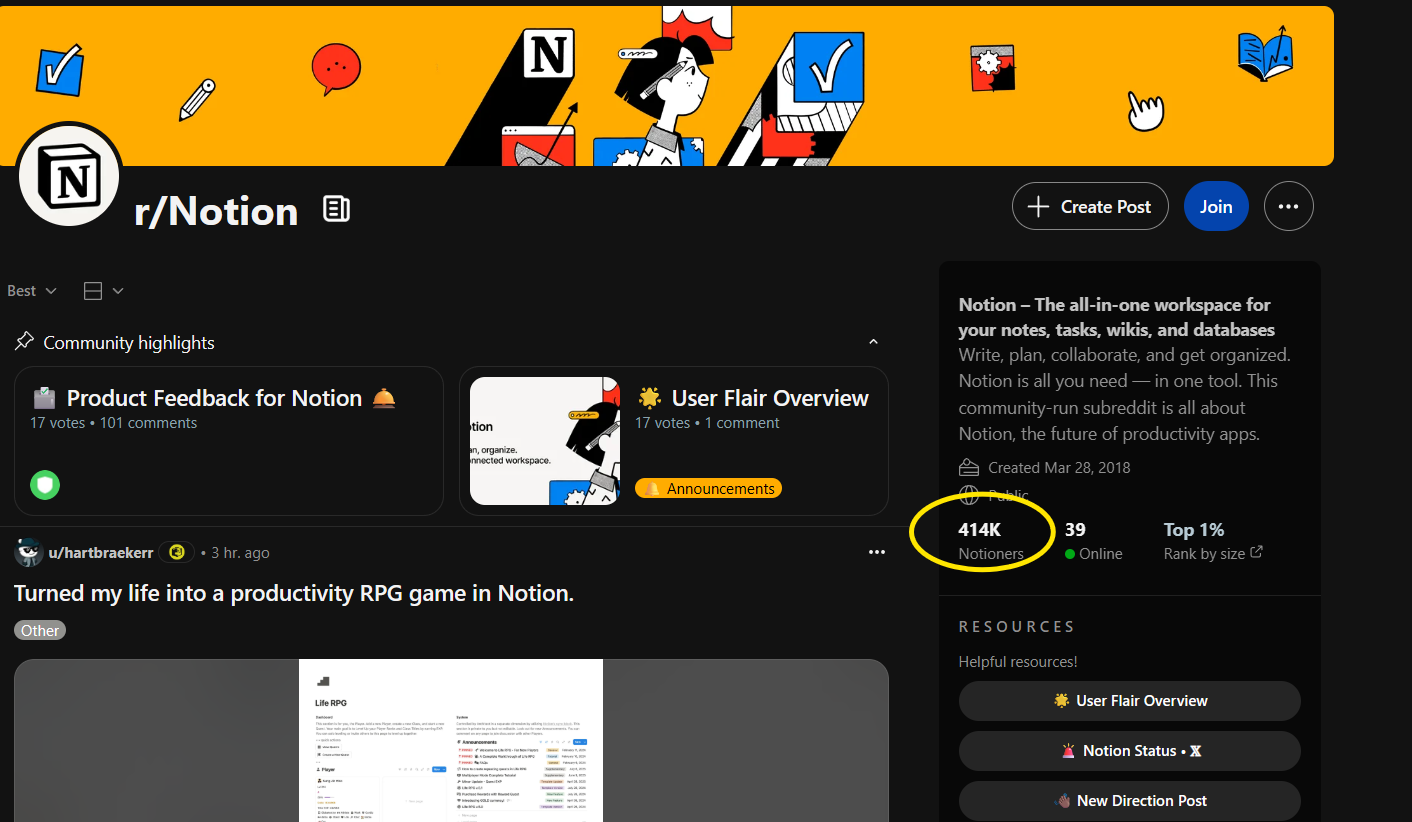 Then there comes Notion’s social media communities, either run by Notion or online creators. These are the communities that work as a marketing channel for Notion and help gain new users. For example, this Sub Reddit has over 400,000 Notioners, aka followers or subscribers. If someone recently started using Notion, they can join this and become a part of the community, creating a viral loop of new customers on autopilot.