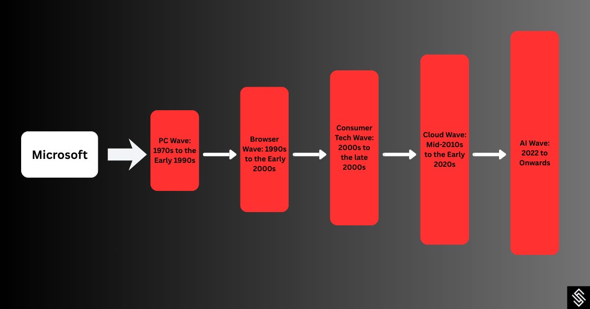 The fascinating thing about Microsoft is that no singular power law product defines the company like Google’s Search, Apple’s iPhone, Amazon’s E-commerce, and Facebook’s Family of Apps. And while it doesn’t have a single power law product, Microsoft is one of the rare companies that rode almost all the technology waves.